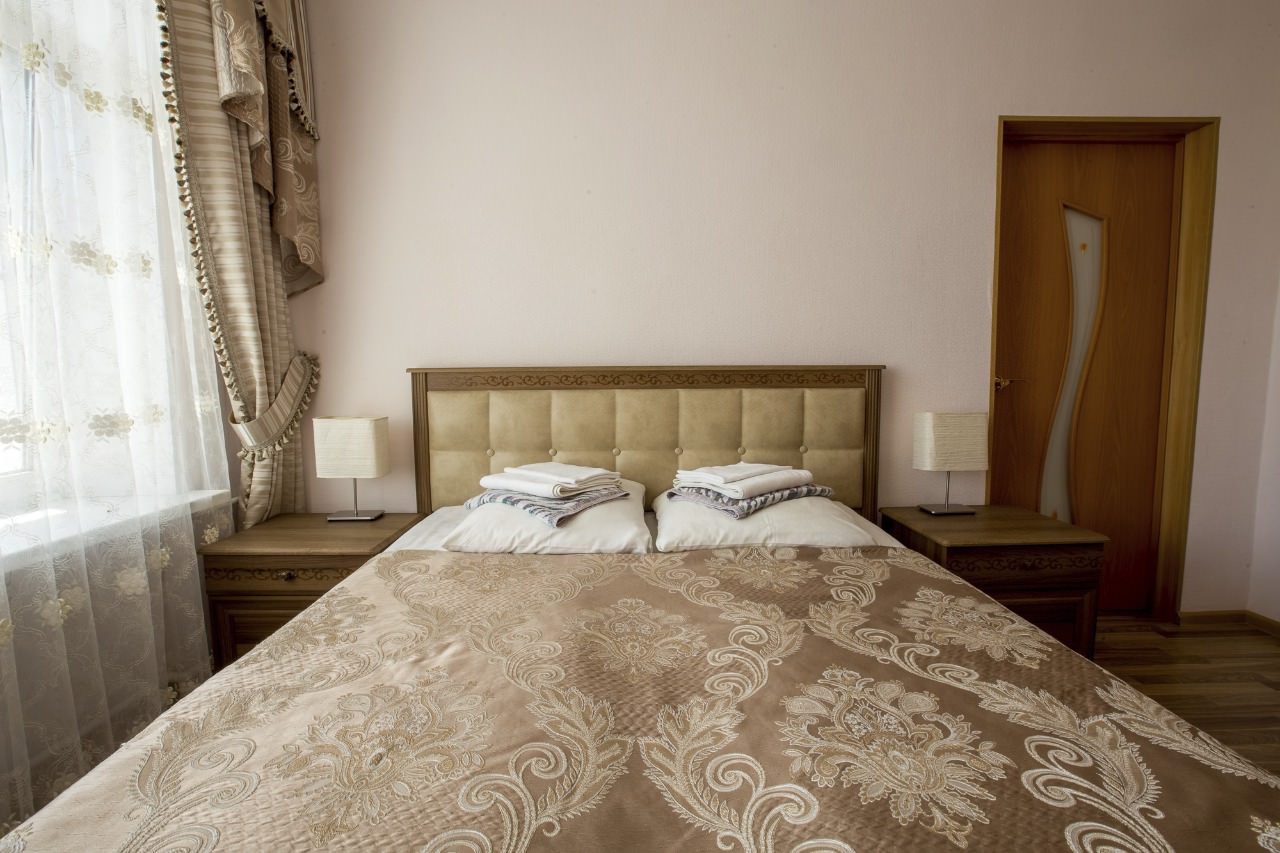 2 осн. места. 3 доп. места. Балкон. Мебель: диван раскладной, кровать двуспальная, прикроватные тумбочки, стол, столик журнальный, столик туалетный, стулья, шкаф. Оборудование: телевизор, холодильник, чайный набор посуды, электрочайник. Санузел: с душевой кабиной, туалетные принадлежности, фен. Сервис: Wi-Fi бесплатно, смена полотенец, смена постельного белья, уборка номера.