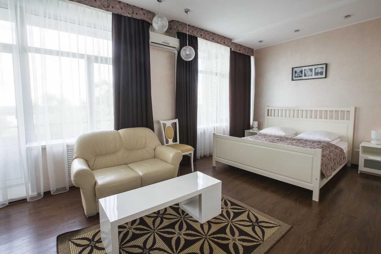 2 осн. места. 1 доп. место. Мебель: диван, кровать двуспальная, прикроватные тумбочки, столик журнальный, шкаф. Оборудование: кондиционер, телевизор, холодильник, чайный набор посуды, электрочайник. Санузел: биде, с душевой кабиной, туалетные принадлежности, фен. Сервис: Wi-Fi бесплатно, смена полотенец, смена постельного белья, уборка номера.